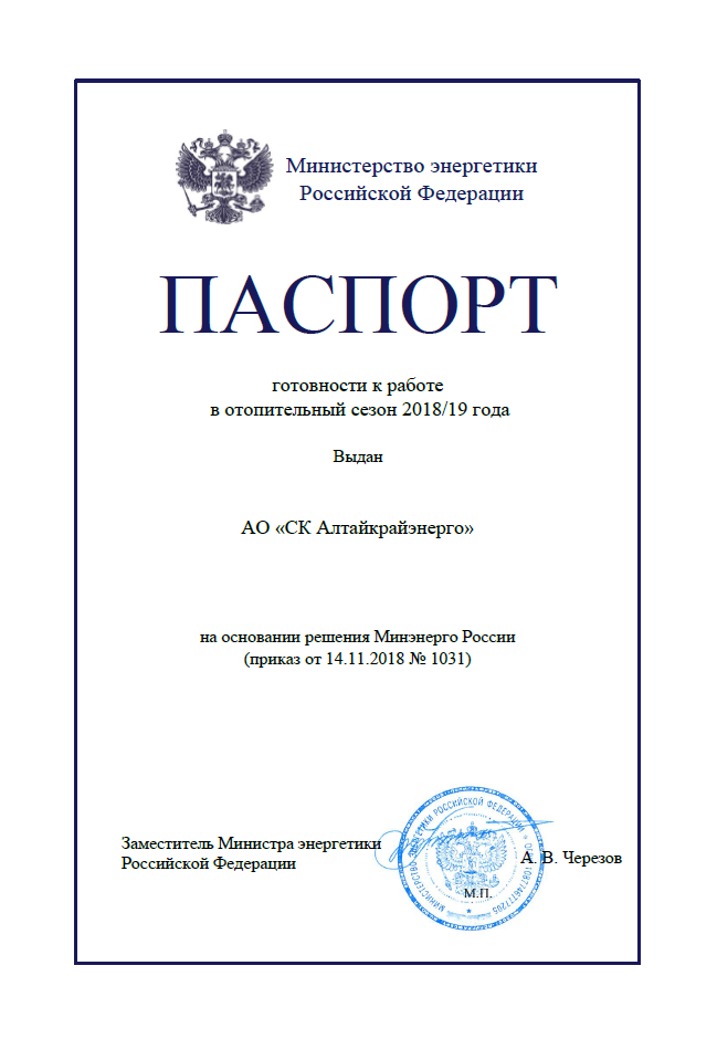 Компания «Алтайкрайэнерго» получила главный документ года - паспорт готовности к работе в отопительный сезон 2018-2019 годов. Получению документа, подтверждающего готовность энергетической компании к зиме, предшествует большая слаженная работа всей команды «Алтайкрайэнерго». Результаты оценки готовности субъектов электроэнергетики к работе в отопительный сезон утверждены Приказом Министерства энергетики Российской Федерации от 14.11.2018 № 1031.